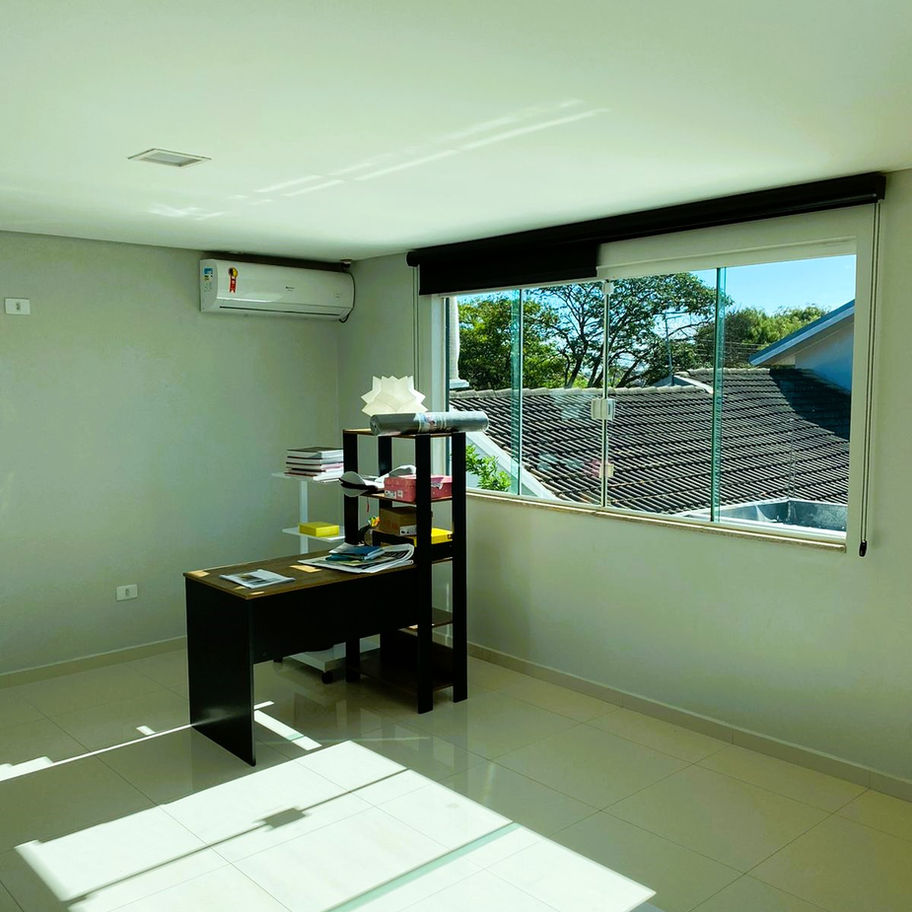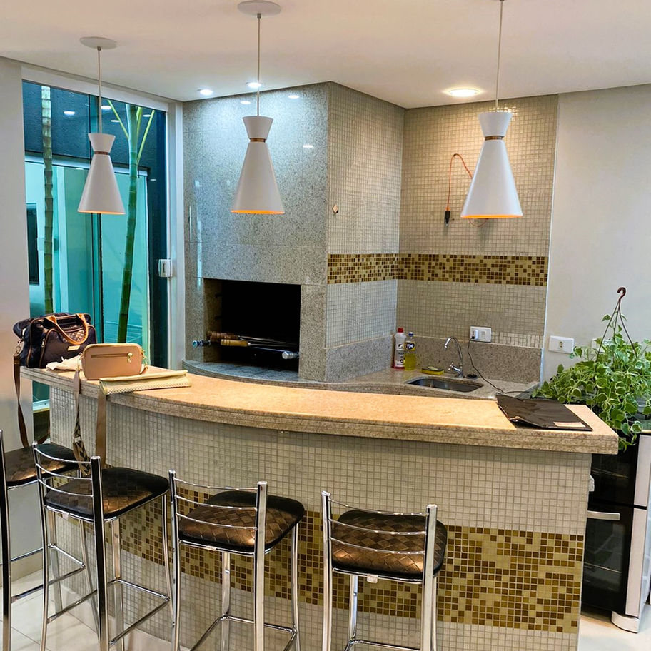 1 lavabo, 1 área gourmet com churrasqueira, 1 sala de tv conjugada com cozinha, 1 escritório na parte superior, 1 lavanderia e 2 vagas de garagem.